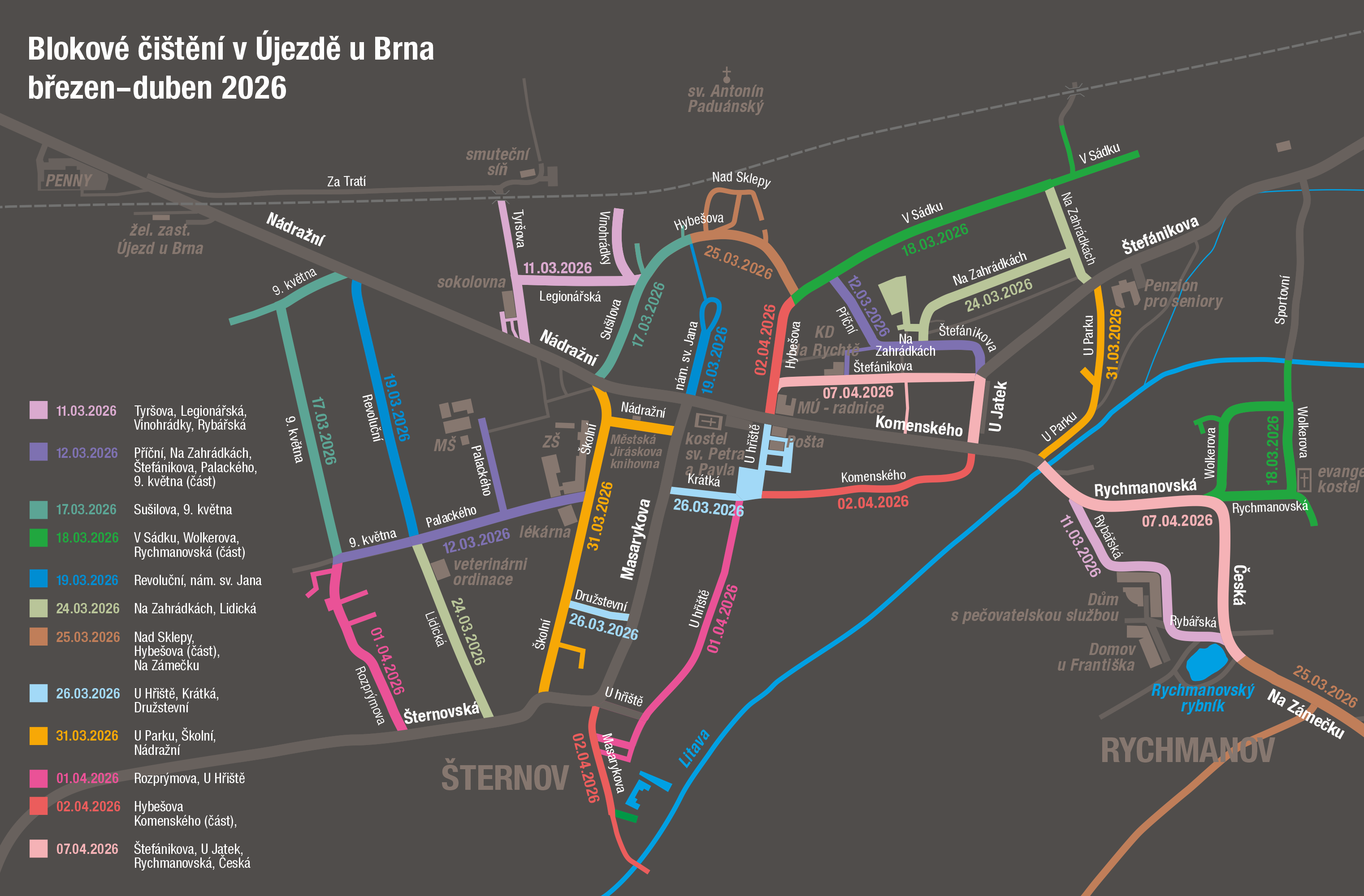 Upozorňujeme občany, že od 11.03.2026 do 07.04.2026 bude probíhat v našem městě blokové čištění ulic. Termíny pro jednotlivé ulice naleznete na přiloženém letáku. Děkujeme za pochopení.