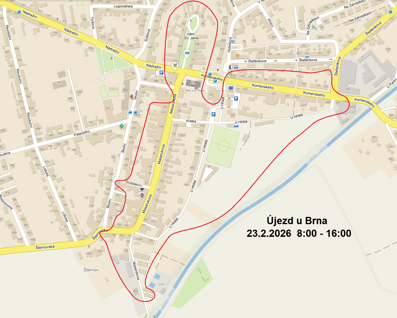 Vypnutá oblast: Újezd u Brna - Družstevní, - Hybešova pouze O2, - Komenského od Nádražní po Štefánikovu a č.p. 1056 mimo č.p. 951, - Krátká, - Masarykova mimo č.p. 70 a ČOV - Nádražní č.p. 56, - Nám. sv. Jana. - U Hřiště, - Šternovská od ul. Masarykova po č.p. 717 a 729, - Štefánikova parcela k…