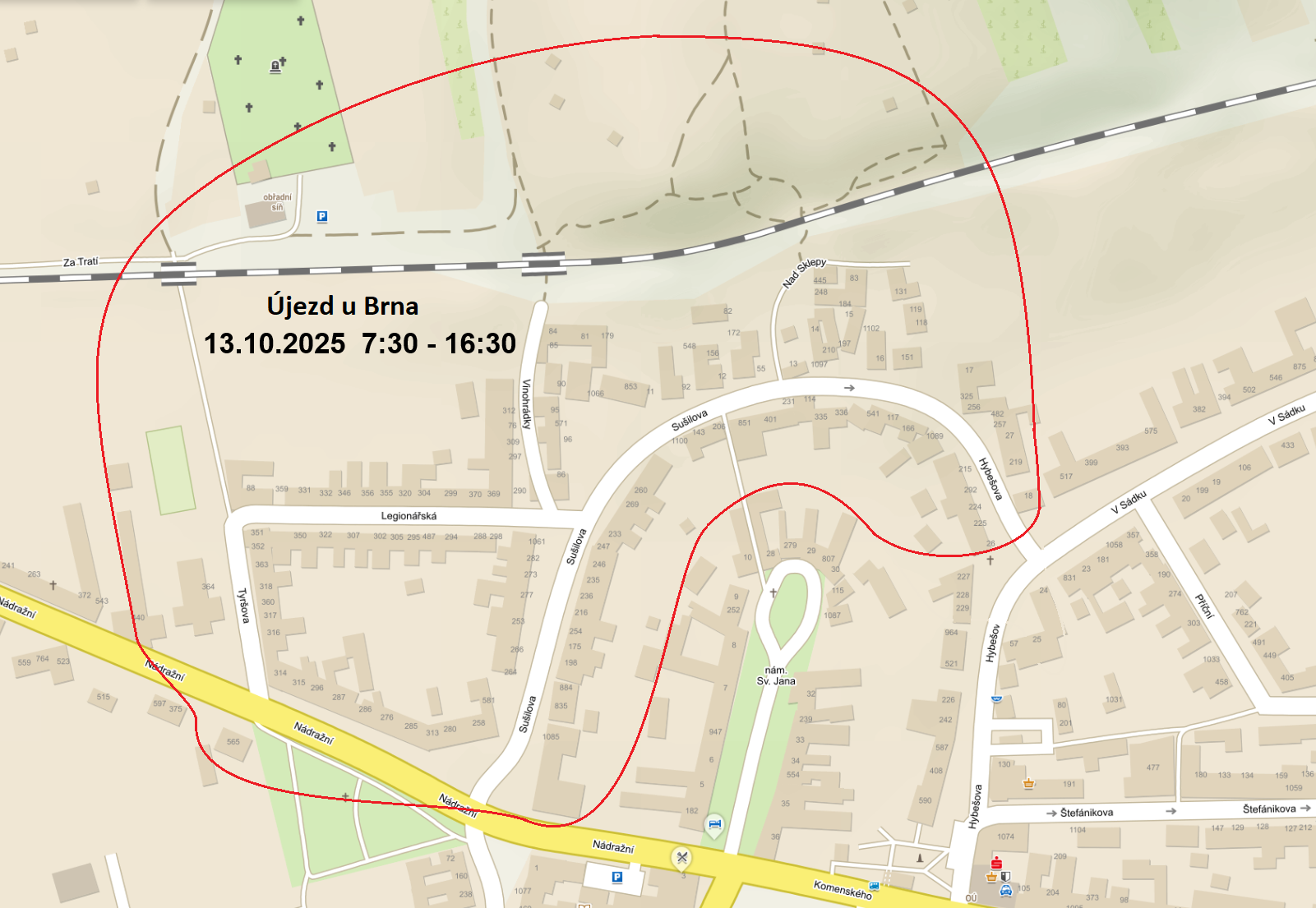 Stanovuje přechodnou úpravu provozu na silnici: č. II/416 – ul. Šternovská, na místní komunikaci: ul. 9.května, ul. Palackého, ul. Lidická a ul. Rozprýmova, vše ve městě Újezd u Brna z důvodu: propojení IS