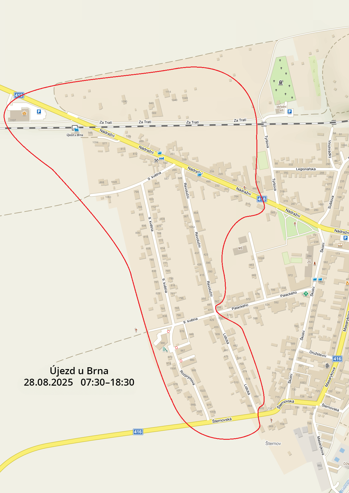 Stanovuje přechodnou úpravu provozu na silnici: č. II/416 – ul. Šternovská, na místní komunikaci: ul. 9.května, ul. Palackého, ul. Lidická a ul. Rozprýmova, vše ve městě Újezd u Brna z důvodu: propojení IS