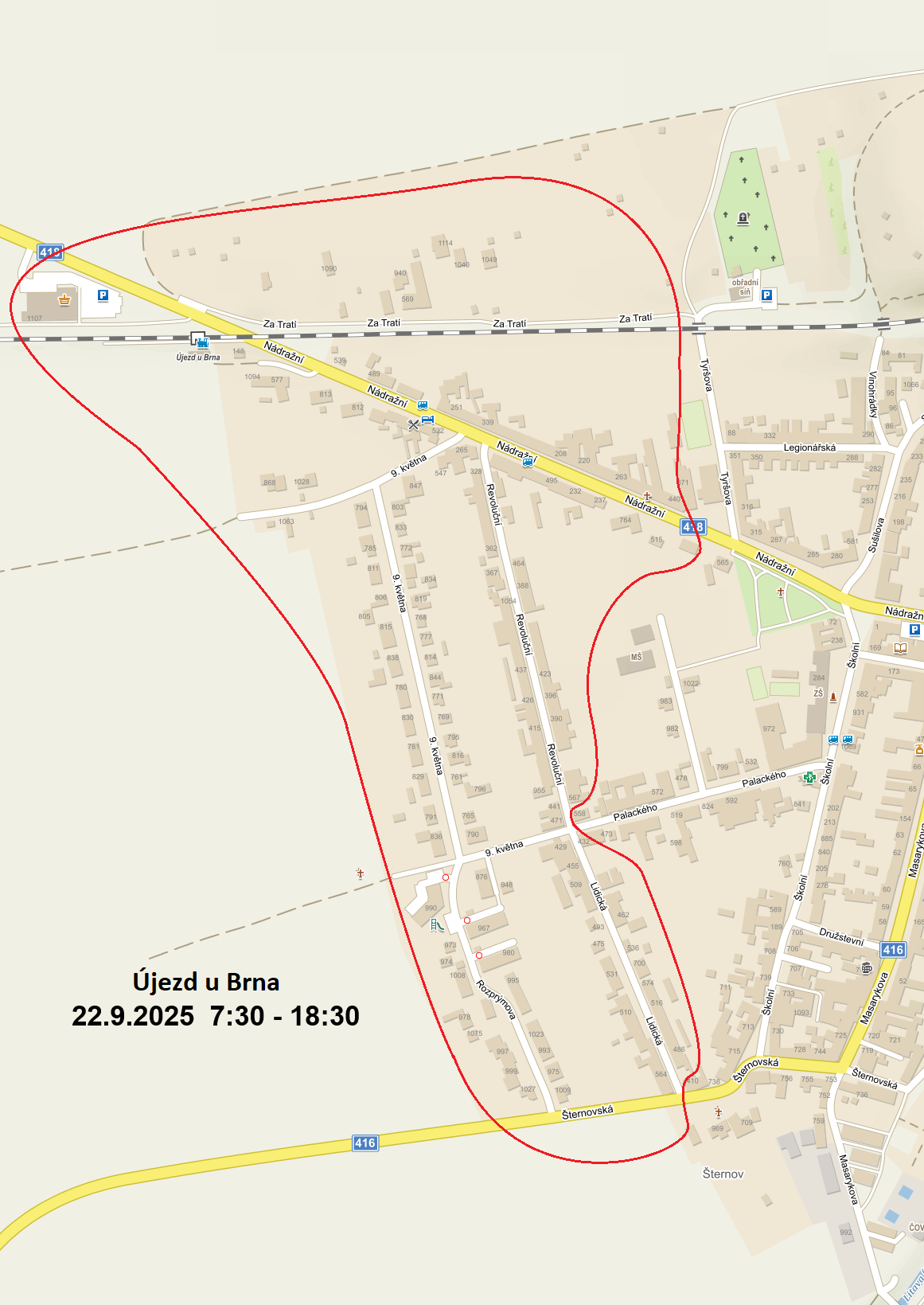 Dne 22.09.2025 od 07:30 do 22.09.2025 18:30. Vypnutá oblast: Újezd u Brna - 9. května, - Lidická mimo č.p. 410, - Revoluční, - Rozprýmova, - Śternovská k/3275, - Nádražní od Penny po č.p. 375 a 440, - Za Tratí mimo hřbitova a obřadní síně