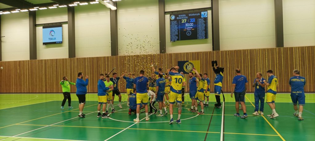 Přepište dějiny! Po sobotní výhře nad TJ Rožnov p. R. 27:22 postoupil poprvé v historii Újezdské házené tým TJ Sokol Újezd u Brna do 1. ligy mužů.